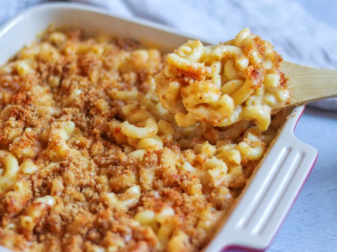 - To make the bread crumb topping, melt 2 tablespoons of butter in a skillet over medium heat. Add breadcrumbs; cook and stir until well coated and browned. Spread breadcrumbs over the macaroni and cheese, then sprinkle with paprika.